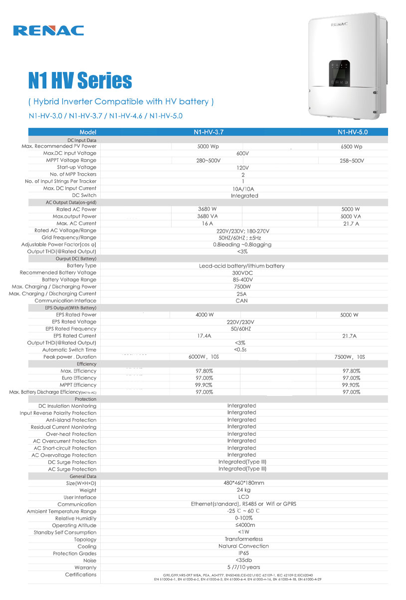 N1 HV Series Hybrid Inverter 5KW Compatible with HV battery
