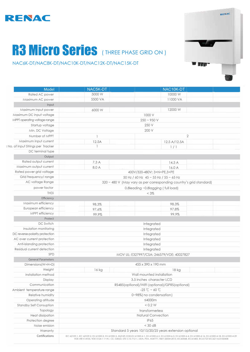 R3 Micro Series Three Phase grid On 10KW, Maximum Input current 12.5A Built-in WIFI/GPRS , Precise MPPT algorithm, Integrated DC switch and inbuilt type II SPD protection